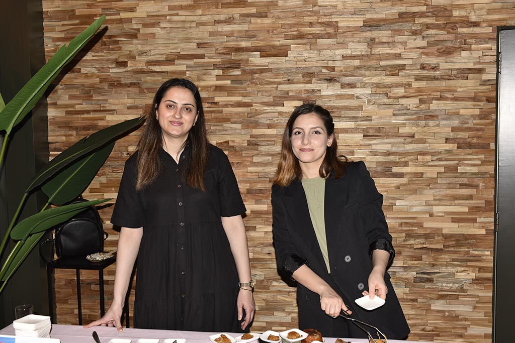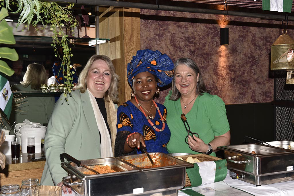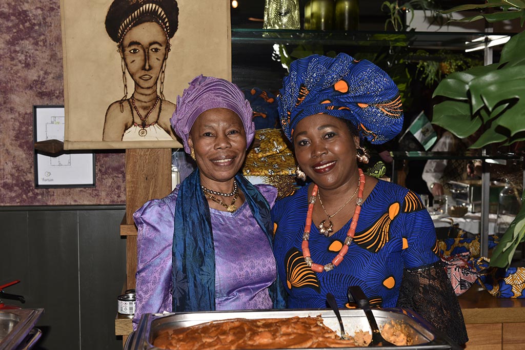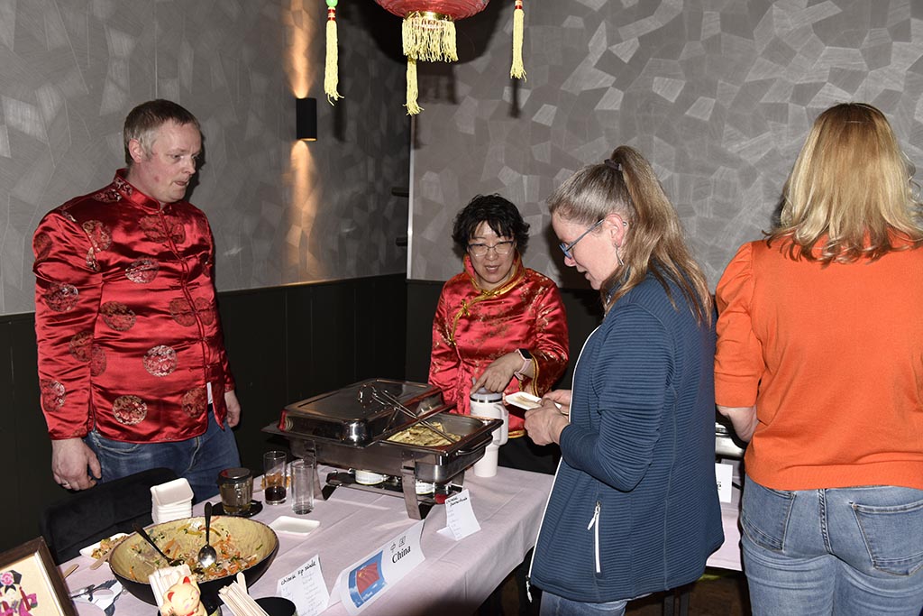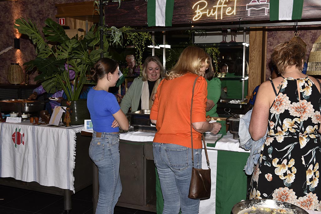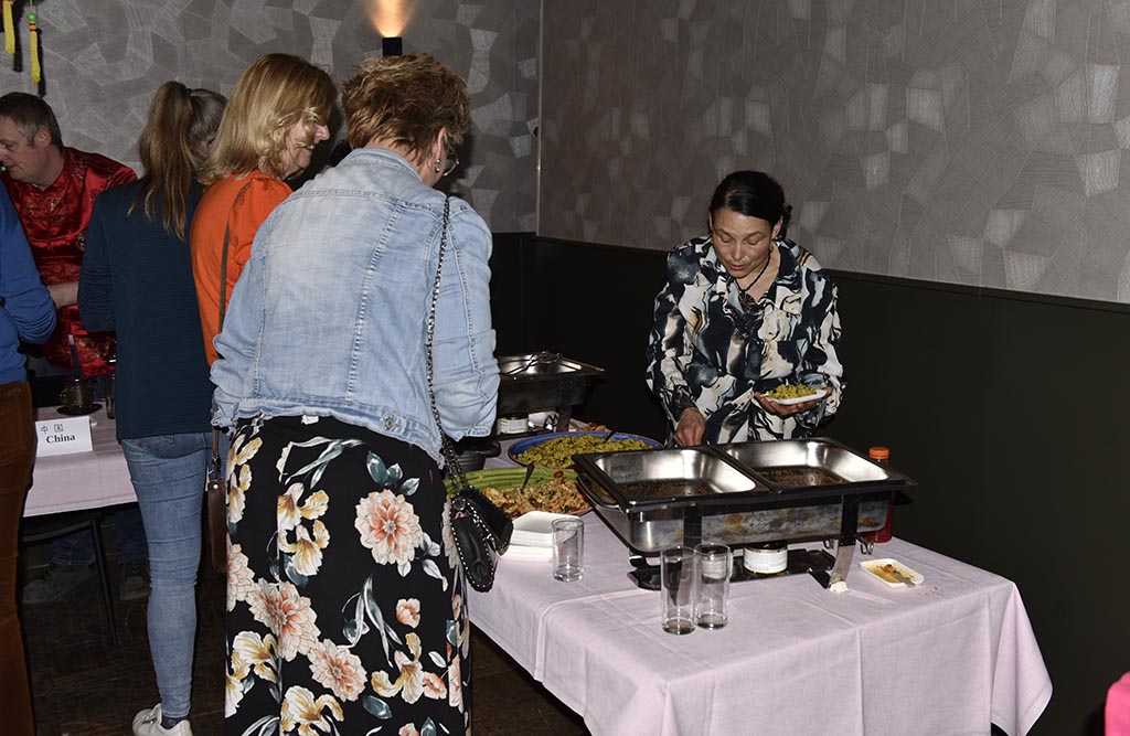Rond kwart voor 2 was het al een drukte van belang en werd het steeds gezelliger. De gerechten waren, en ik spreek uit eigen ervaring, ontzettend lekker en soms heel pittig. Monique (Benin) had een tweetal sausjes gemaakt: de een heel mild en de ander iets pittiger. Nou dat heb ik geweten. En wat te denken van Joyce (Nigeria). Het was echt smullen. En laat ik Suxian (China) niet vergeten, heerlijk. Vera (Brazilië) had ook behoorlijk uitgepakt zeg. En niet te vergeten de dames uit Irak. Ze waren hier voor de 3de keer en eerlijk gezegd was de tafel waar alles op stond een beetje te klein. Ik neem heel diep mijn pet af voor de dames uit het CNO (Colombia, Turkije, Kurdistan en Syrië) en hun “begeleider” Thijs. Het zag er niet alleen heerlijk uit maar het smaakte ook zo. Ik heb zelfs een paar mensen foto’s zien maken van de recepten. Ik hoop dat het bij hen thuis net zo zal smaken.